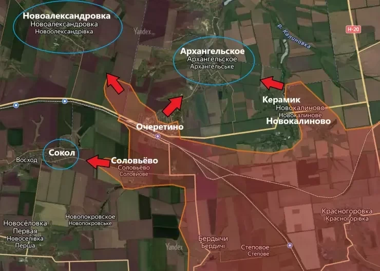 Тем самым от Очеретино по водораздельному хребту ВС РФ охватывают Архангельское с запада. Что признают и вражеские ресурсы.