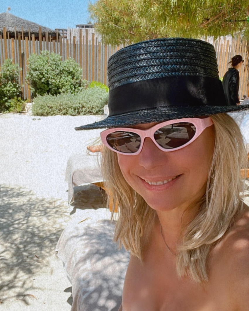 Позднее Салтыкова позагорала на пляже, закрыв глаза солнечными очками и защитив свою голову шляпой.
