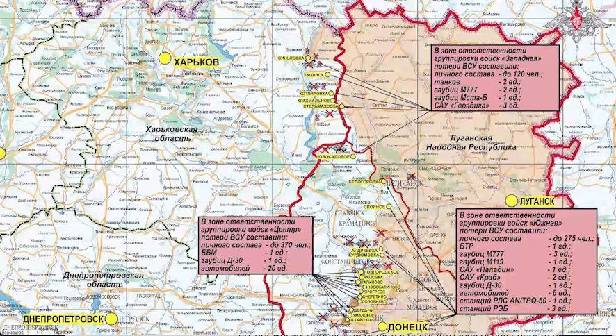 Всего с начала проведения специальной военной операции уничтожено: 594 самолета, 270 вертолетов, 23817 беспилотных летательных аппаратов, 512 зенитных ракетных комплексов, 15940 танков и других боевых бронированных машин, 1280 боевых машин реактивных систем залпового огня, 9364 орудия полевой артиллерии и минометов, а также 21535 единиц специальной военной автомобильной техники.