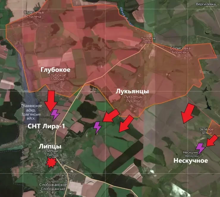 На Харьковском направлении продолжаются активные боевые действия в южнее посёлка Глубокое в СТ Лира и юго-западнее Лукьянцы. ВС РФ давят в направлении Липцы, Веселое и Терновое.