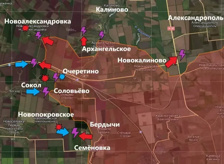 В направлении Сокола к западу от Очеретино - без существенных изменений. Взята одна посадка в направлении Сокола. К северо-западу ВС РФ ведут штурмовые действия на окраинах Новоалександровки. Бои постепенно смещаются в жилую застройку.