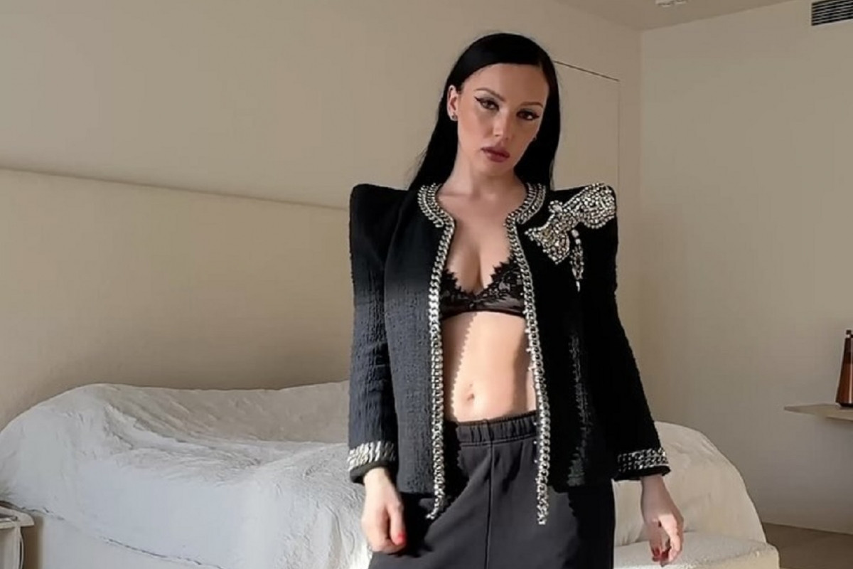 На другом видео 39-летняя артистка предстала в мини-юбке и бра, сочетая их с удлиненными брюками и спортивными штанами. Образ она дополнила черным жакетом с серебристыми цепями и стразами. Певица сделала красный маникюр.