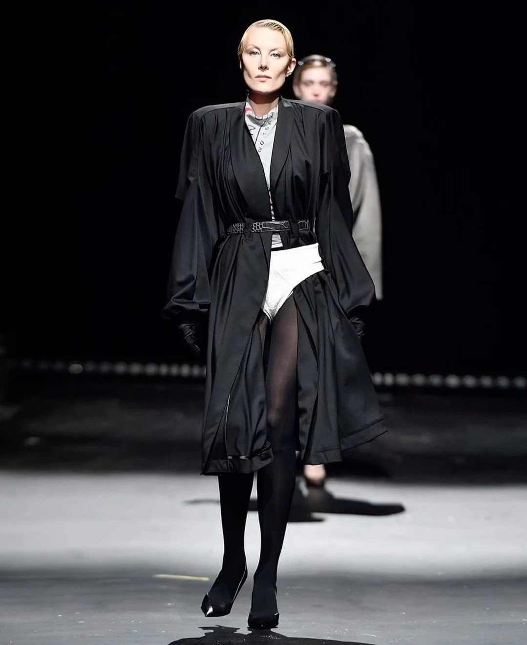 На подиуме Литвинова, которой исполнилось 57 лет, продемонстрировала черное пальто длиной до колена, подчеркнувшее тонкую талию поясом. Один край был заправлен в высокие трусы, которые Рената надела поверх прозрачных колготок.