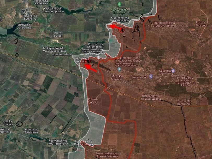 На юге не прекращаются бои в центральной части Красногоровки. С востока российские войска проламывают оборону противника вдоль улицы Нахимова и берега реки Лозовая, формируя «полукотёл» для подразделений ВСУ, обороняющихся в частном секторе и на территории парка им. Шевченко.