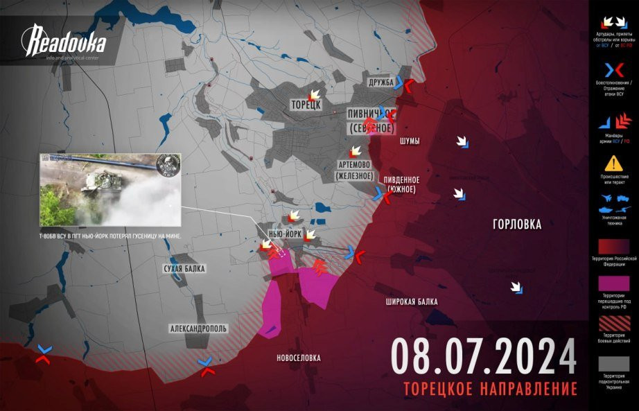ВС РФ развивают наступление и под Торецком в Нью-Йорке. В поселке русская армия закрепилась в микрорайоне Петровская Гора. ВСУ, не выдержав натиска, отступили с внешних оборонительных рубежей в капитальную жилую застройку и на машиностроительный завод, за который сейчас идёт бой. Действия наших войск указывают на то, что они наносят удары по флангам оборонительных позиций ВСУ для того, чтобы выйти к лежащей за Нью-Йорком Нелеповке и перерезать снабжение засевших в многоэтажках украинских подразделений.