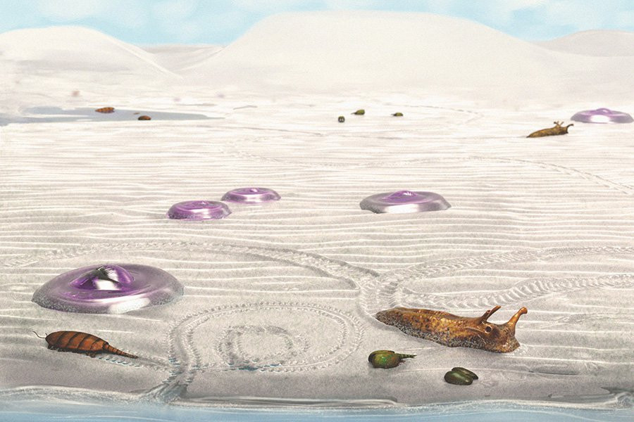 Существует еще один тип окаменелостей, дающий подсказки о том, когда древние животные впервые вышли из моря, — это ископаемые следы. Они представляют собой остатки жизнедеятельности организмов и включают в себя следы и норы животных.