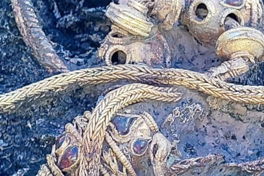 Среди них также много оружия, нагрудник, золотое ожерелье, золотая диадема, золотое кольцо, нож, украшенный золотыми элементами и полудрагоценными камнями. Рядом с телом человека была также найдена лошадь, что указывает на то, что воин, должно быть, был всадником из богатой семьи.