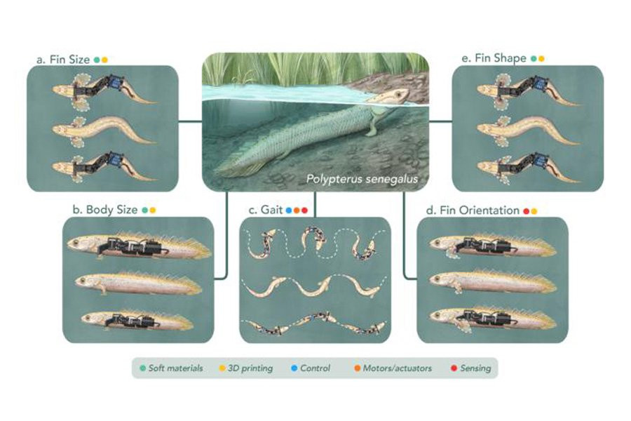 При финансовой поддержке программы Human Frontier Science Program команда разрабатывает роботов, вдохновленных палео, частично черпая вдохновение из современных «ходячих рыб», таких как илистые прыгуны, и из окаменелостей вымерших рыб. «В лаборатории мы не можем заставить живую рыбу ходить по-другому, и мы, конечно, не можем заставить ископаемое двигаться, поэтому мы используем роботов для моделирования их анатомии и поведения», — сказал Ишида.