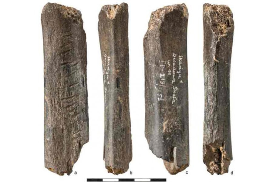 «Это делает его одним из самых ранних следов символической культуры, зафиксированных в Евразии, который представлен серией из семнадцати надрезов, сделанных кремневым инструментом с широкими краями, возможно, двусторонним ножом. Текущий анализ показывает, что метки были сделаны за один сеанс правшой посредством многократных надрезов, в основном с использованием техники, при которой движение было направлено на себя. Судя по всему, надрезы не имели никакой практической цели», — пишут авторы исследования.