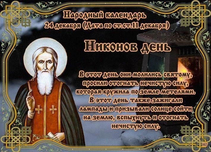 В День Преподобного Никона, 24 декабря, православные верующие идут в церковь и молятся у иконы святого, прося о защите и избавлении от нечистых сил. Никон считается покровителем от злых духов, его молитвы приносят мир и избавление от бед.