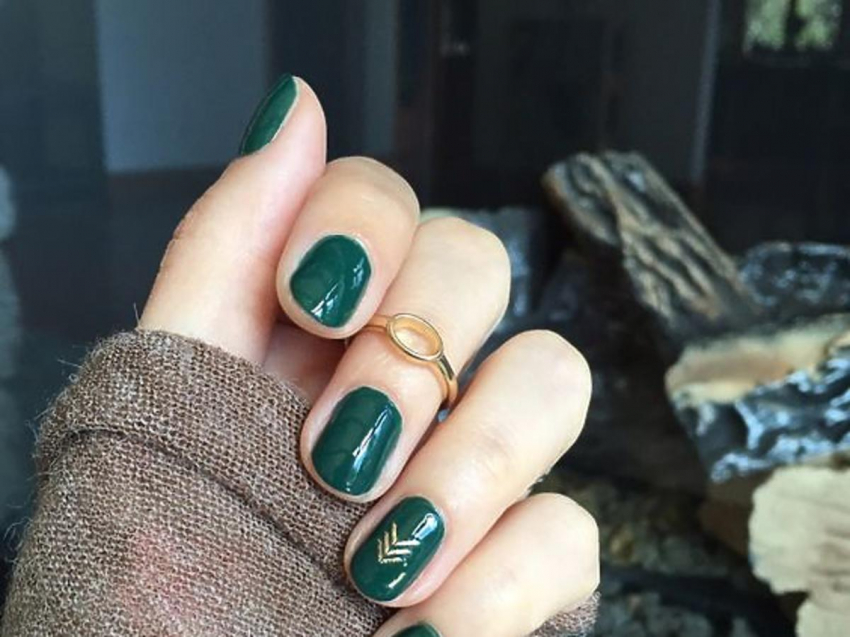 Приглушенный изумрудный цвет — это элегантное решение для тех, кто предпочитает темные оттенки, но не готов к синему маникюру. Этот глубокий и насыщенный цвет выглядит стильно и привлекательно, особенно в сочетании с золотыми украшениями.