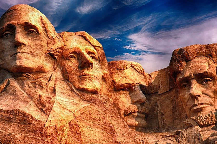 Мемориал на горе Рашмор представляет собой высеченный в граните барельеф высотой 18,6 метра с портретами четырех американских президентов: Джорджа Вашингтона, Томаса Джефферсона, Теодора Рузвельта и Авраама Линкольна. Мемориал был создан в 1927-1941 годах под руководством скульптора Гутзона Борглума и приурочен к 150-летию основания США.